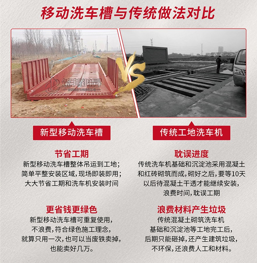 筑邦鴻昇研發(fā)的鋼結(jié)構(gòu)移動洗車槽池由鋼結(jié)構(gòu)洗車槽池、工地洗車機、鋼制沉淀池組成。采用整體設(shè)計,整體吊運,用料厚實。替代了之前的工地洗車機下面的水泥基礎(chǔ),更加牢固方便,節(jié)省了大量的基礎(chǔ)砌筑人工和材料,還可以重復(fù)使用。如果不需要重復(fù)使用;十幾噸重的洗車槽做廢鐵賣,也能賣好幾萬,大大節(jié)省了施工時間和成本。鋼結(jié)構(gòu)洗車槽池常規(guī)款式有16.6米長和13米長,尺寸可以定制。