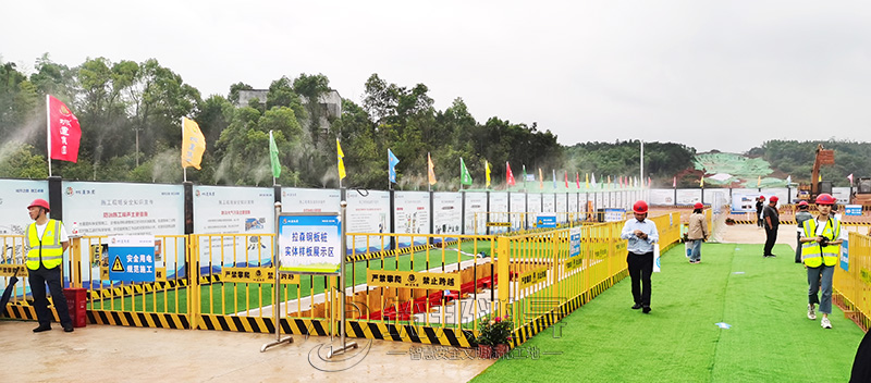 4、工程新技術(shù)新工藝應(yīng)用。GRF裝配式護(hù)坡工藝、拉森鋼板樁工藝、安全防護(hù)工具化、360度高壓霧樁噴淋系統(tǒng)和微頂管工藝展示。