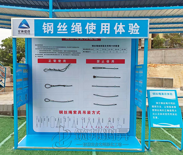 此次合作的工地安全體驗館建設(shè)包括了鋼絲繩使用體驗、綜合用電演示體驗、滅火器演示體驗、平衡木體驗、安全防護用品展示體驗、安全帽撞擊體驗等。