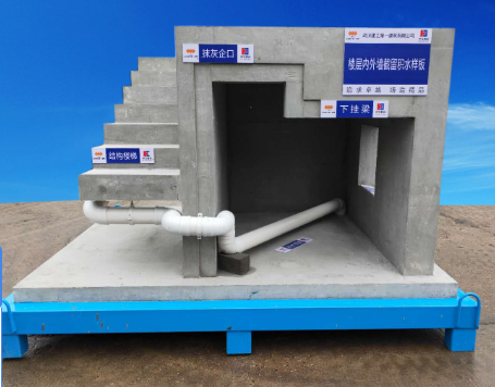工藝展示:結(jié)構(gòu)樓梯混凝土成型,抹灰企口,下掛梁,窗臺企口,外墻積水槽,射釘固定,積水收集口,排水管道安裝固定等工藝。