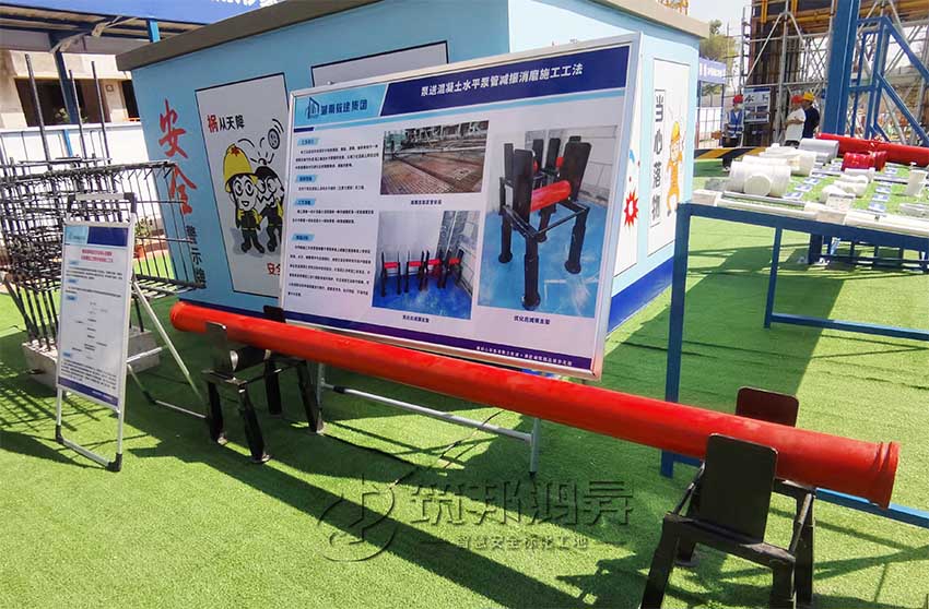 在觀摩會現(xiàn)場,還有一個紅色圓柱外形的東西吸引了眾多觀摩人員的注意。湖南教建集團有限公司國欣向榮廣場項目項目總指揮長李海平介紹,這是其公司自創(chuàng)的泵送混凝土水平泵管減振消磨施工工法。該工法運用的關(guān)鍵在于利用鋼筋、鋼板、滾筒、軸承等制作一種減振支架作為混凝土輸送水平泵管的支座,以減少在混凝土泵送過程中泵管振動對已綁扎好的鋼筋骨架、模板的影響。
